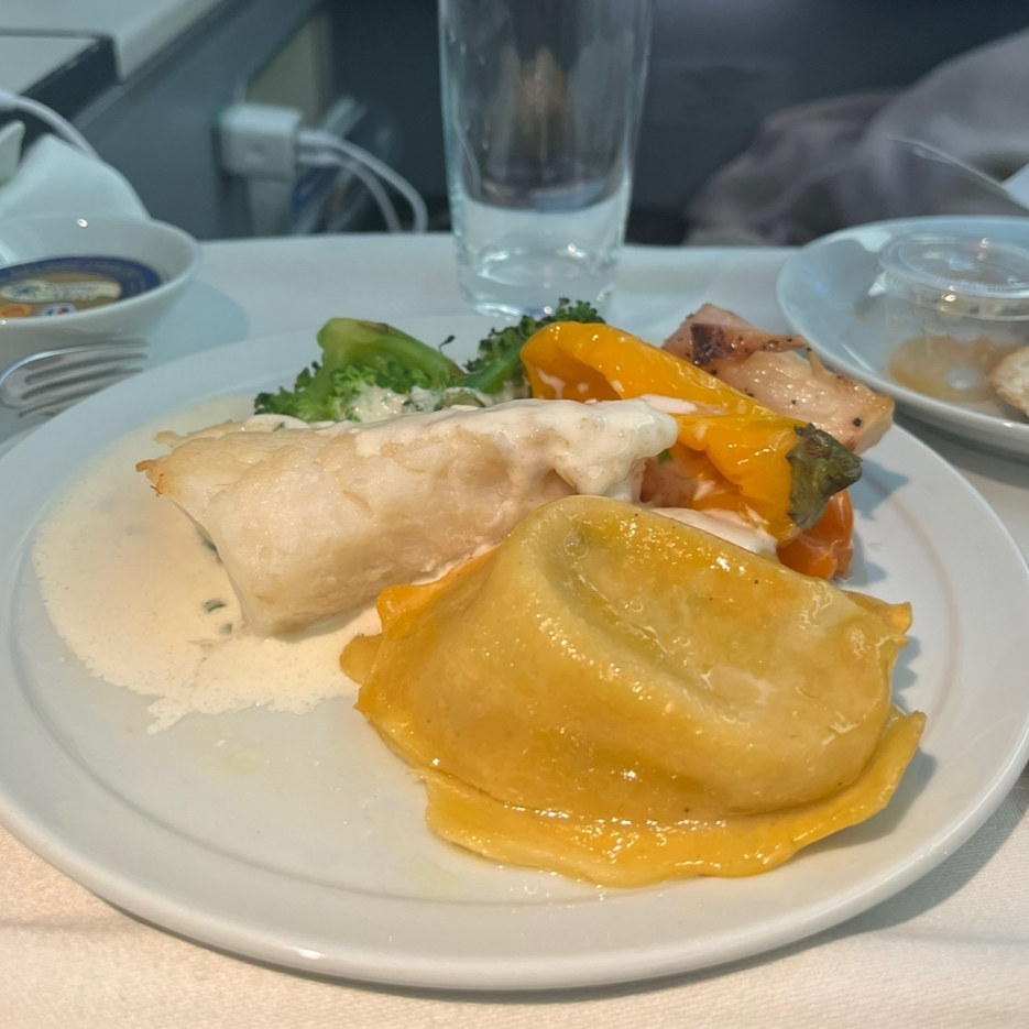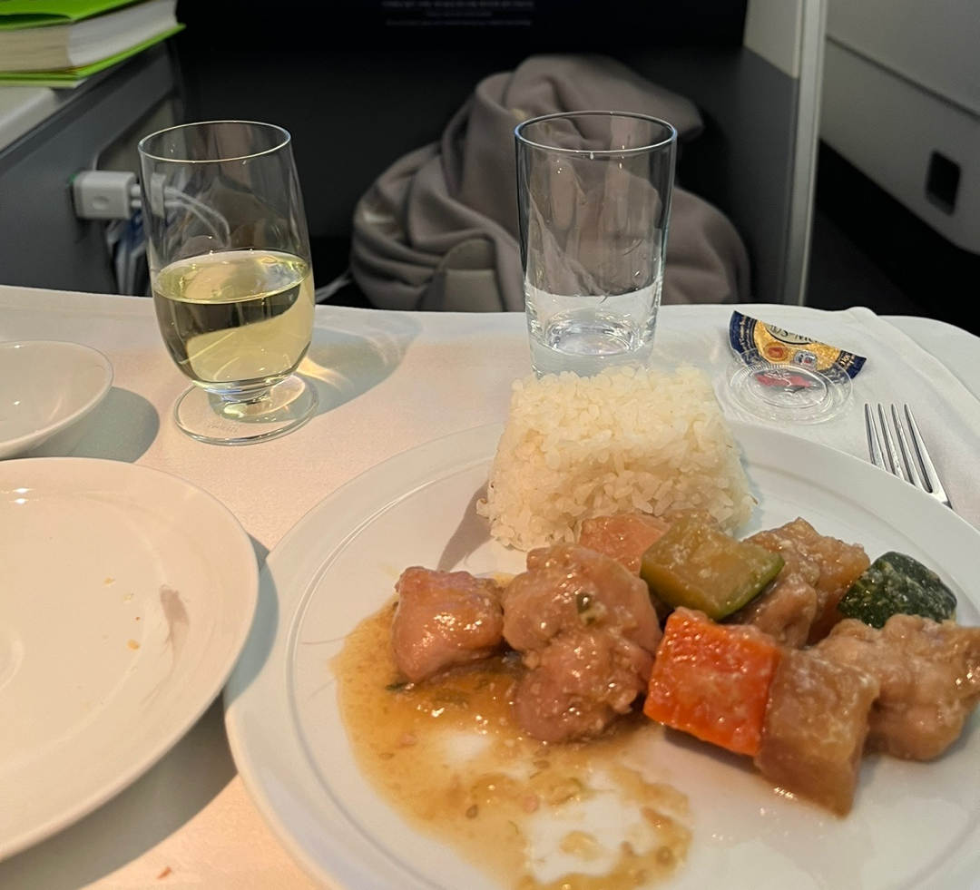 두 번의 식사가 나오는데, 두 번 모두 코스요리이며, 첫 식사는 5가지 메뉴, 두 번째 식사는 3가지 메뉴로 코스가 나온다. 올 때 갈때 모두 동일한 방식이었다.