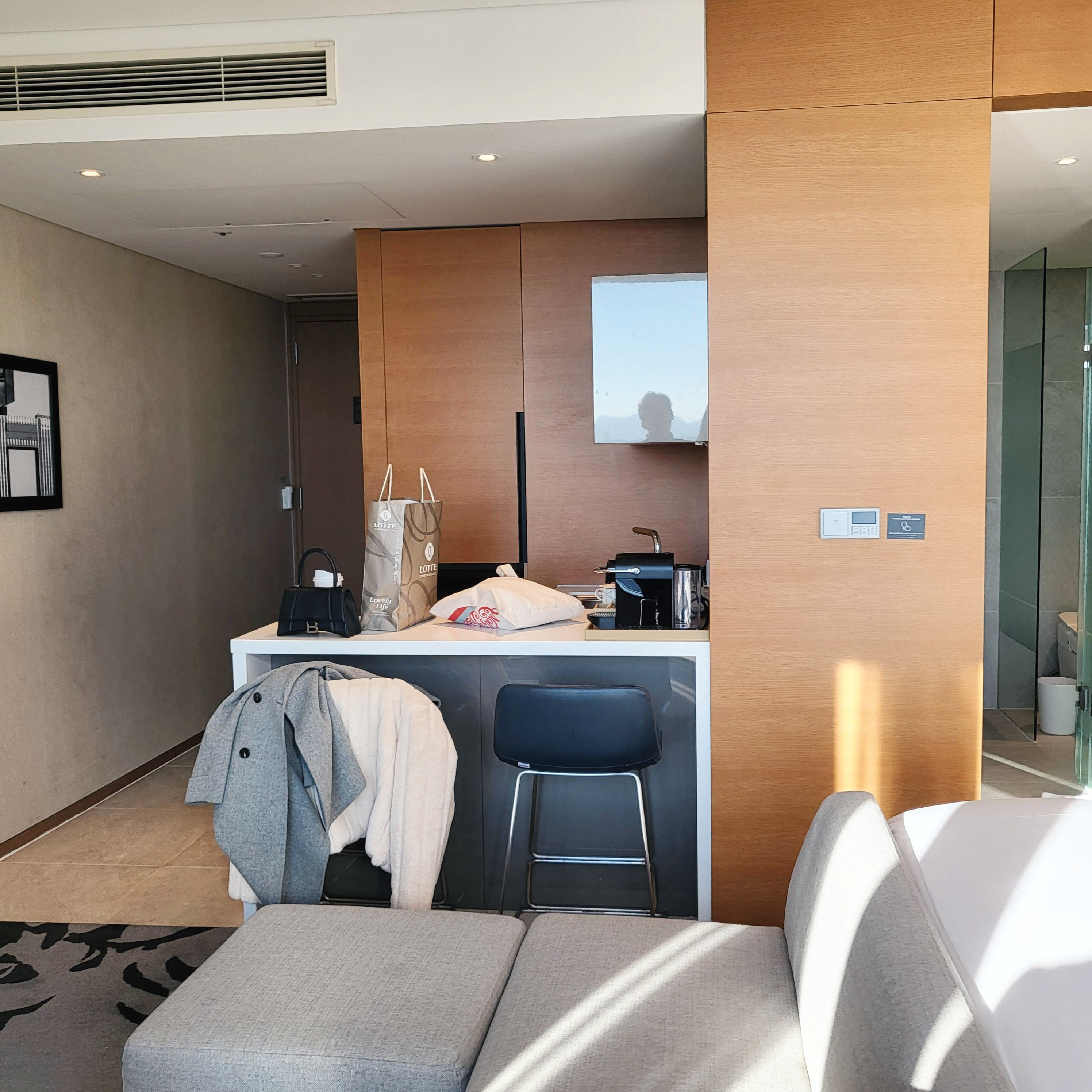 욕실 옆 공간에 작은 바가 있는데 커피머신과 의자가 있어서 아침에 모닝커피하기 딱 좋아보였습니다. 저곳에서 창밖 풍경을 보며 커피를 내리고 한 잔 음미하는 것을 상상했는데 상상만으로도 행복~