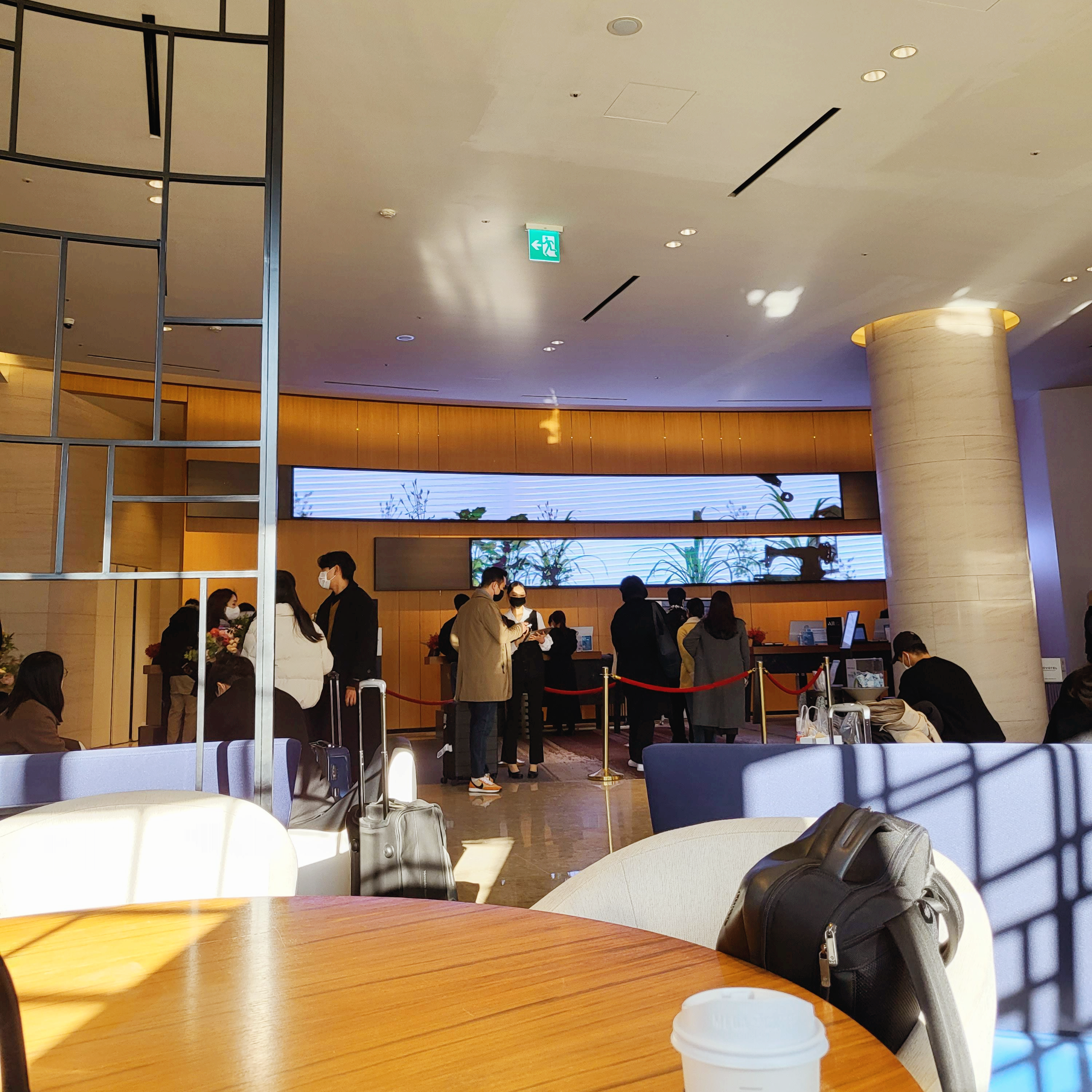기다릴 자리도 없어서 모르는 사람과 테이블을 공유하며 기다렸습니다. 오히려 왼편에 있는 이코노미호텔 이비스스타일이 체크인하기 훨씬 좋아보이더라고요. 체크인은 첫인상인데, 아쉬움이 컸습니다.
