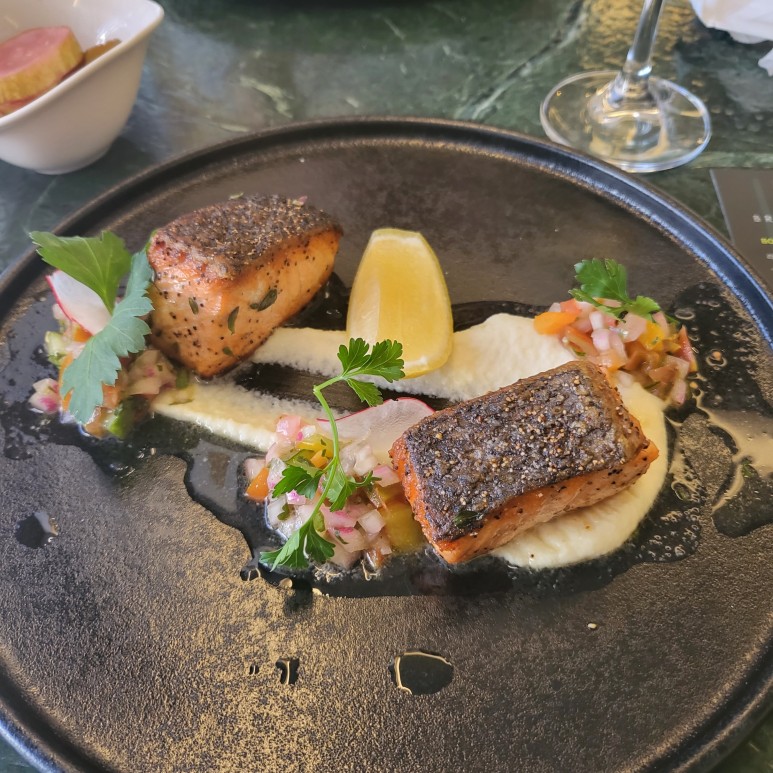 연어가 나오기 직전에 화이트와인을 시켰는데 이에 조화가 끝내준다....