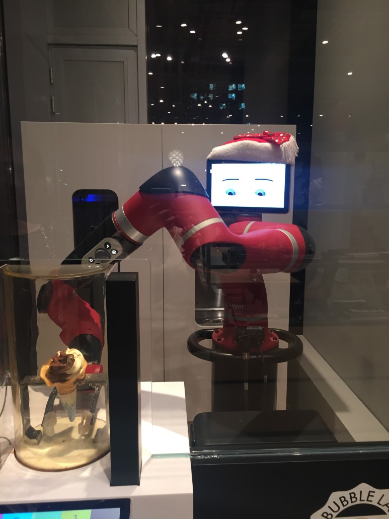 교내에는 IT카페도 있었습니다. 왼쪽 사진은 아이스크림 로봇입니다. 돈을 내면 로봇이 카페직원처럼 팔의 관절을 빙빙 돌려서 아이스크림을 만들어줍니다. 2023년인 지금은 로봇이 커피를 주기도 하지만, 북경에 도착했던 2017년에는 한국에서 로봇 활용도가 높지 않았기 때문에 꽤나 놀라웠습니다. 오른쪽은 정수기인데 원하는 물의 양과 온도를 손가락으로 조절해서 주문하면 저 예쁜 디자인에서 주문한대로 물이 나옵니다.