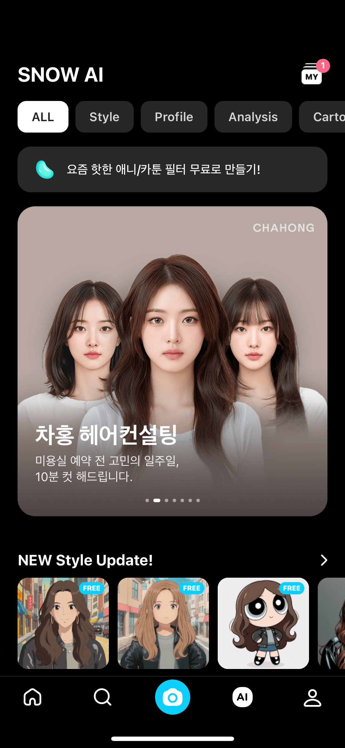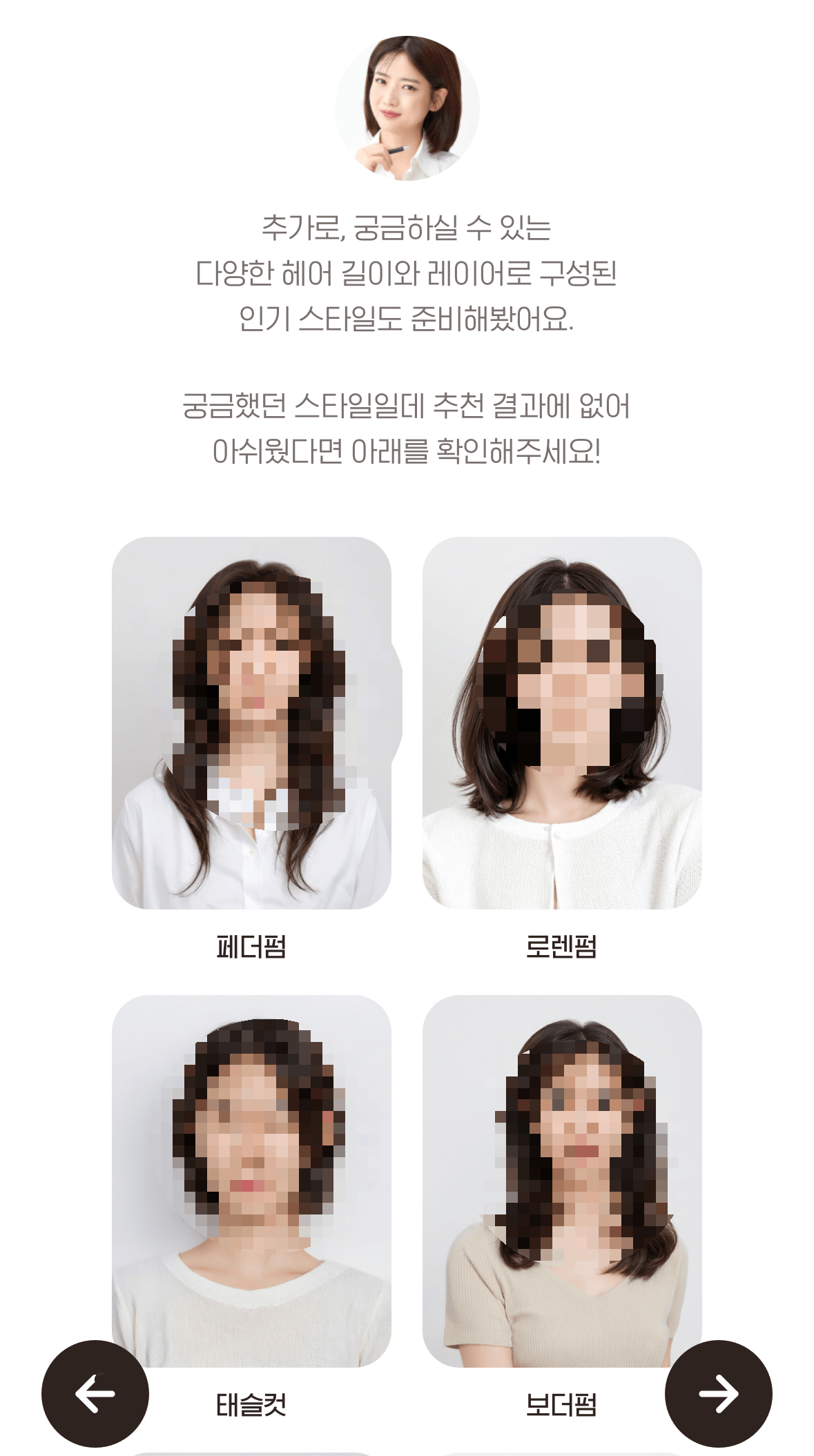 위의 사진처럼 가장 추천하는 3가지 이미지가 나타나고 (나는 다양한 길이의 머리를 모두 보고 싶다고 선택하여 숏컷, 단발, 장발이 한장씩 나온 듯 싶다),