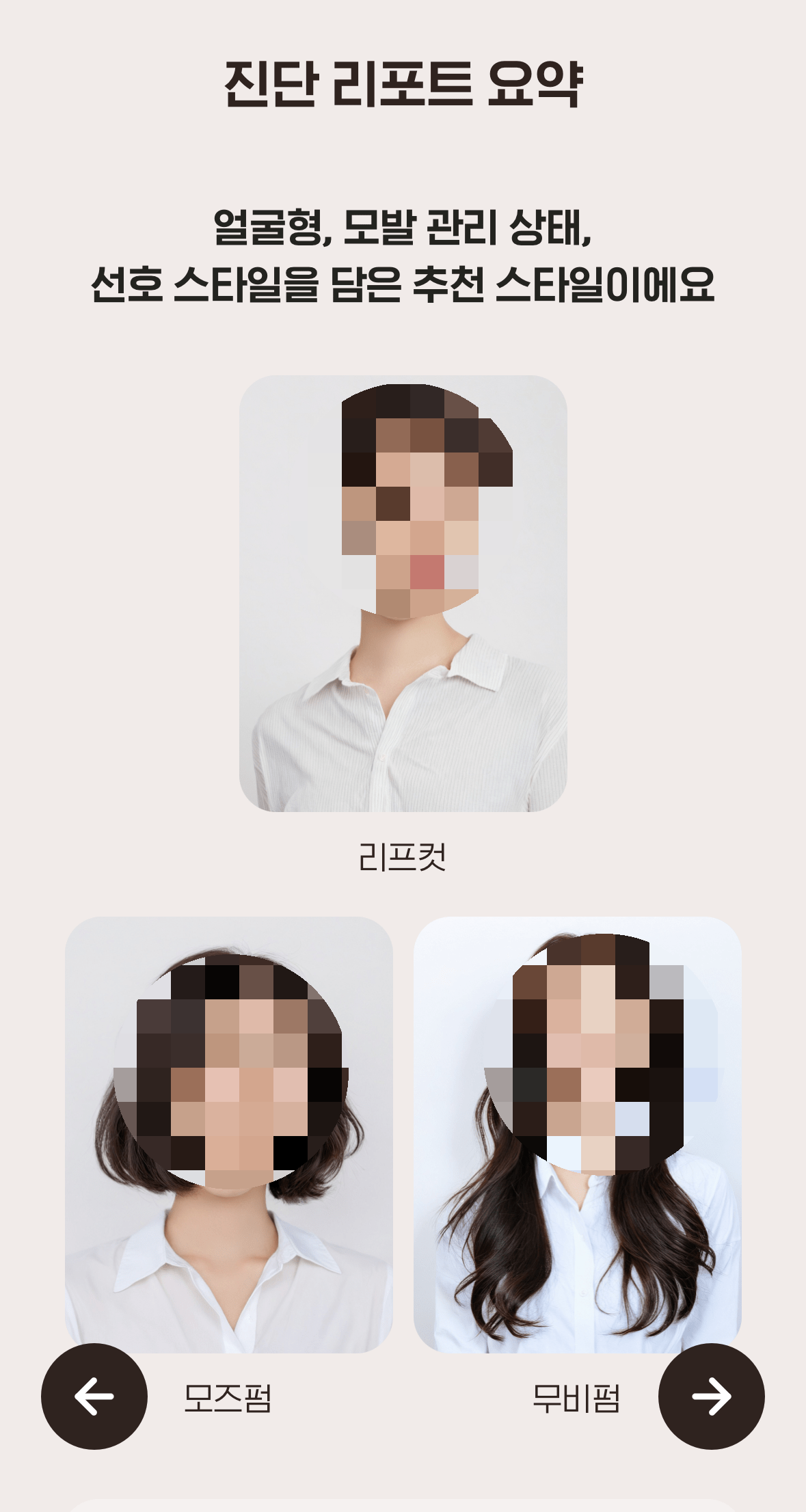 50여 가지 헤어스타일 중 분석한 얼굴형, 얼굴 비율, 모발 관리 스타일, 선호하는 이미지 등을 종합하여 가장 추천하는 헤어디자인 3종을 AI로 미리 합성하여 볼 수 있다.