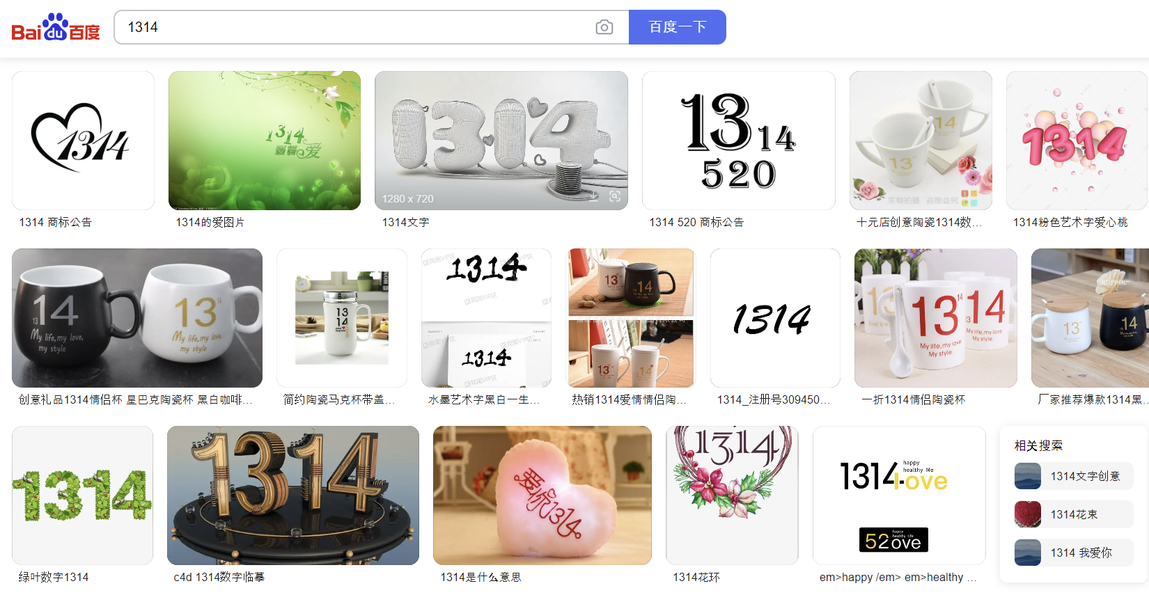 중국의 대표 포탈사이트인 바이두(Baidu)에 1314를 검색하면 위와 같이 사랑과 연인, 커플 아이템 관련된 다양한 이미지가 나옵니다.